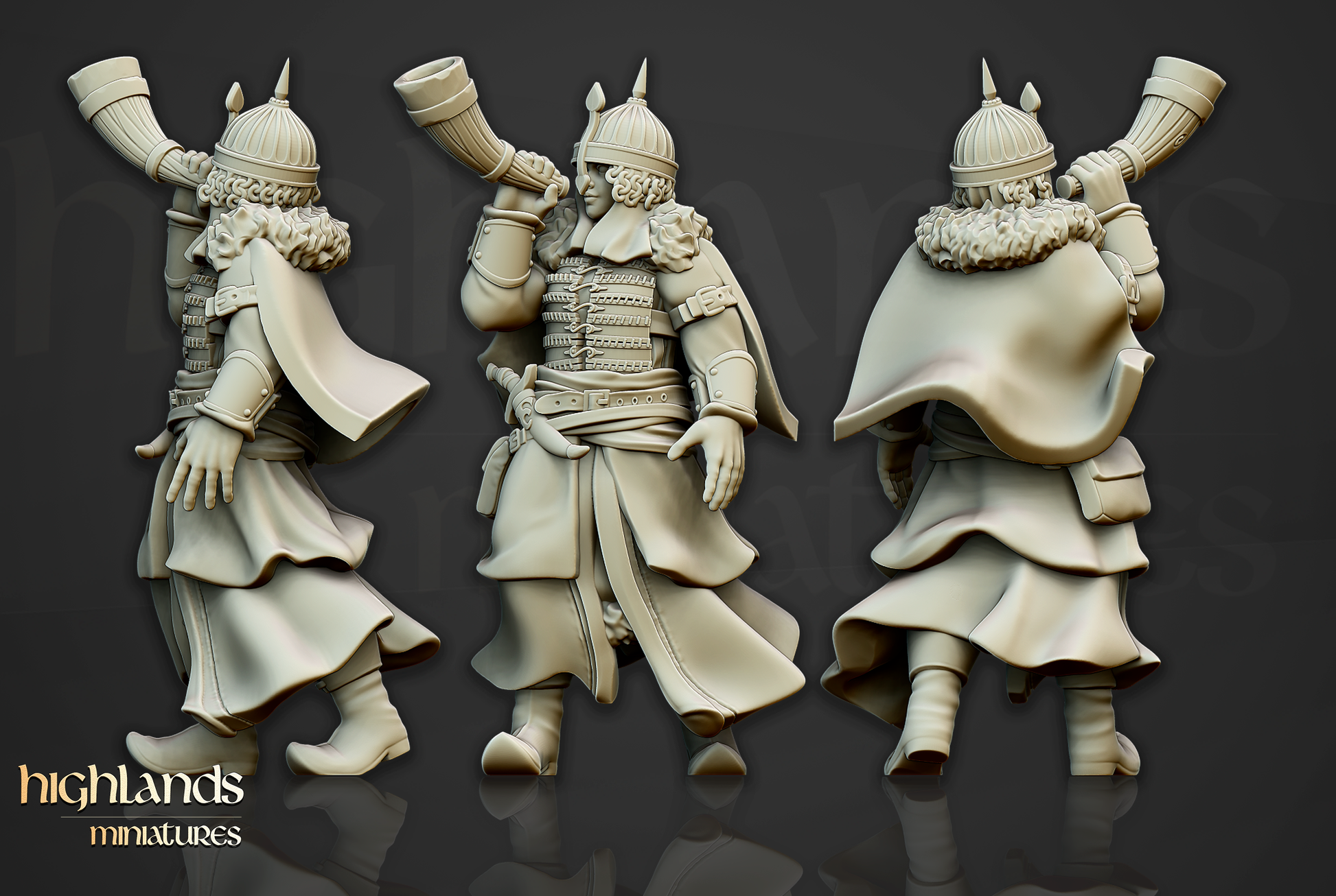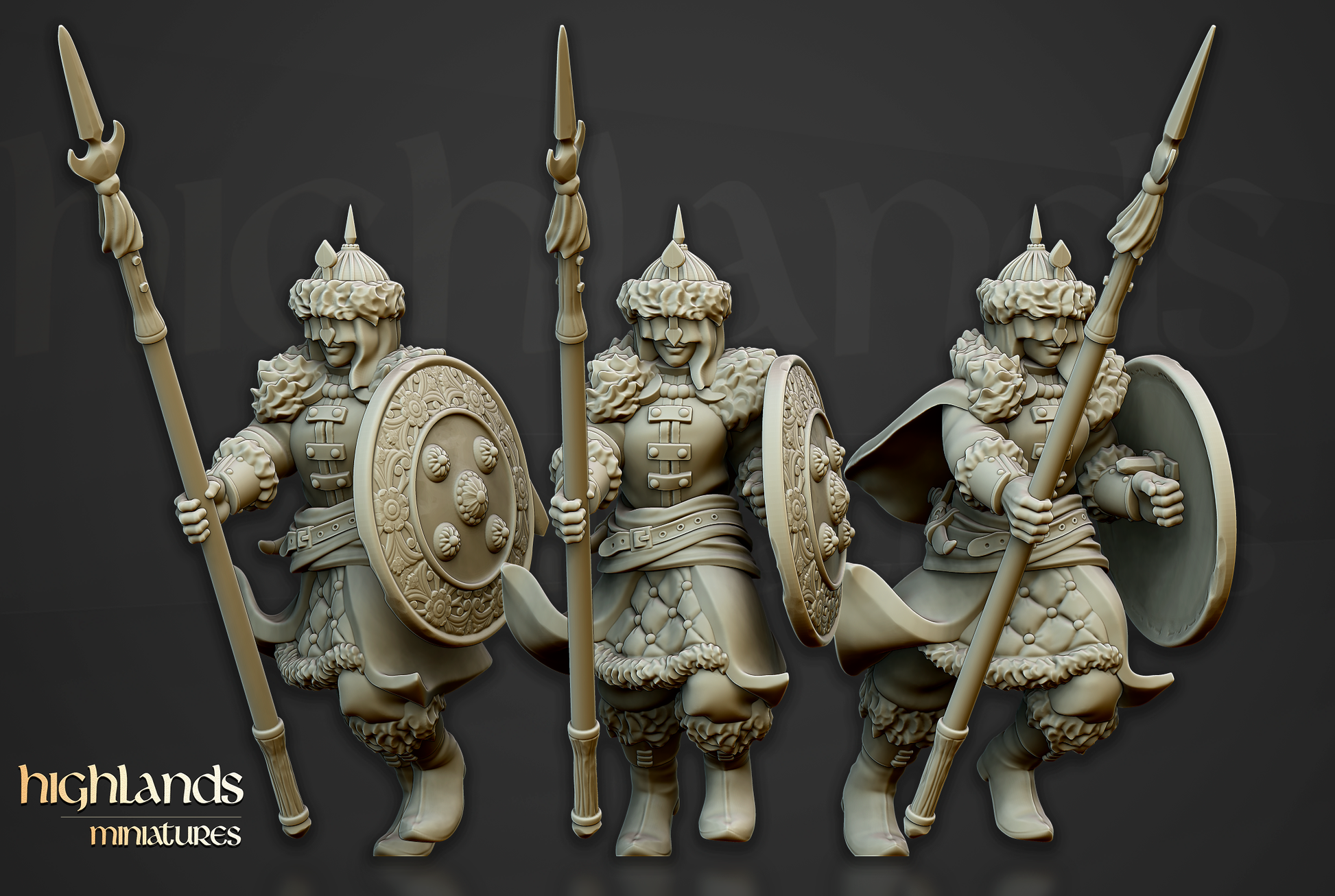 Infantry with heavy spears and round shields. Outfitted in gear that blends steppe themes and typical gear of northern warriors. These models are a strong fit for proxy Kislevite infantry, shieldmaidens, or frontline troops in fantasy wargames.