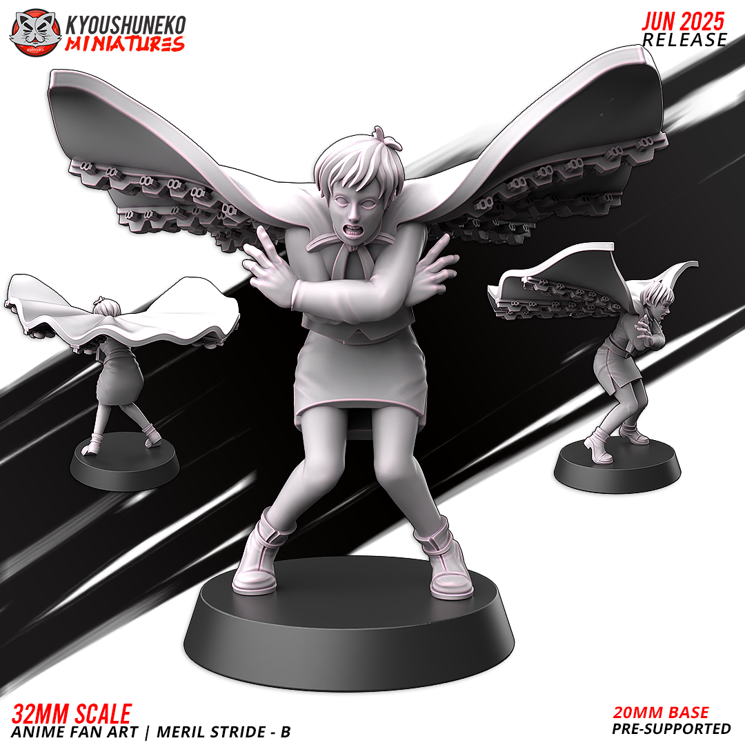 32 mm scale resin figure inspired by an anime companion character, sculpted with a long cloak, skirt, and soft features. Works as a civilian, support character, or light-duty operative proxy in sci-fi or anime-themed tabletop games.