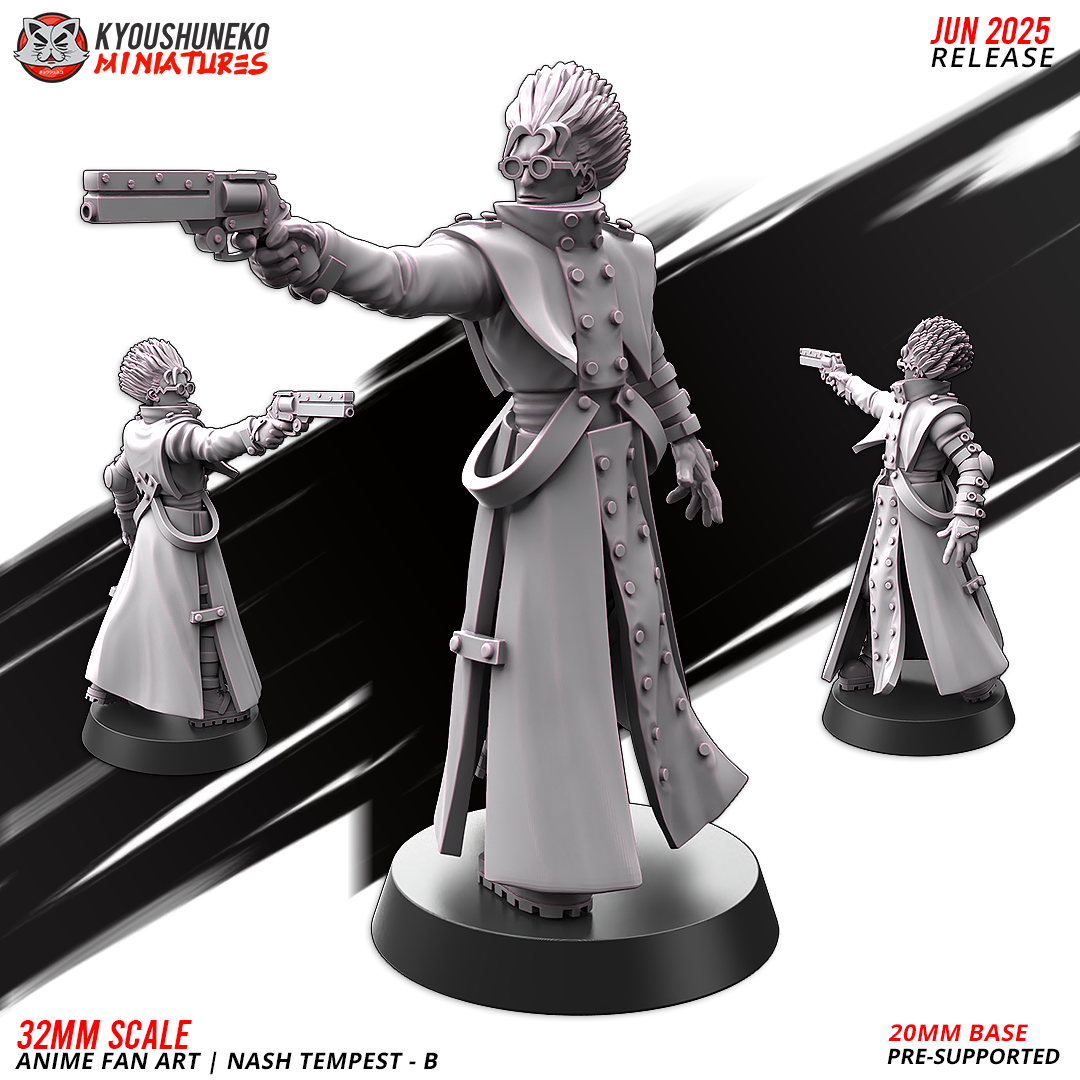 This is a 3D-printed anime-style gunslinger miniature with a long coat, raised pistol, and stylized hair. It works as a generic stand-in for trench-coat gunfighters or heroic shooter characters in skirmish and RPG systems. Scaled for 32mm tabletop play and supplied as a physical resin print.