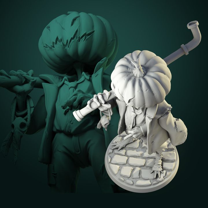 Resin miniature of a pumpkin-headed scarecrow, dressed in tattered clothing and posed with eerie lantern and clawed hands. Crisp sculpting across the jack-o’-lantern face, fabric textures, and cobblestone base gives painters opportunities for weathering, glowing effects, and spooky highlights. Crafted by White Werewolf Tavern, this 32mm or 75mm scale model makes a perfect addition to Halloween tabletop encounters or gothic display collections.