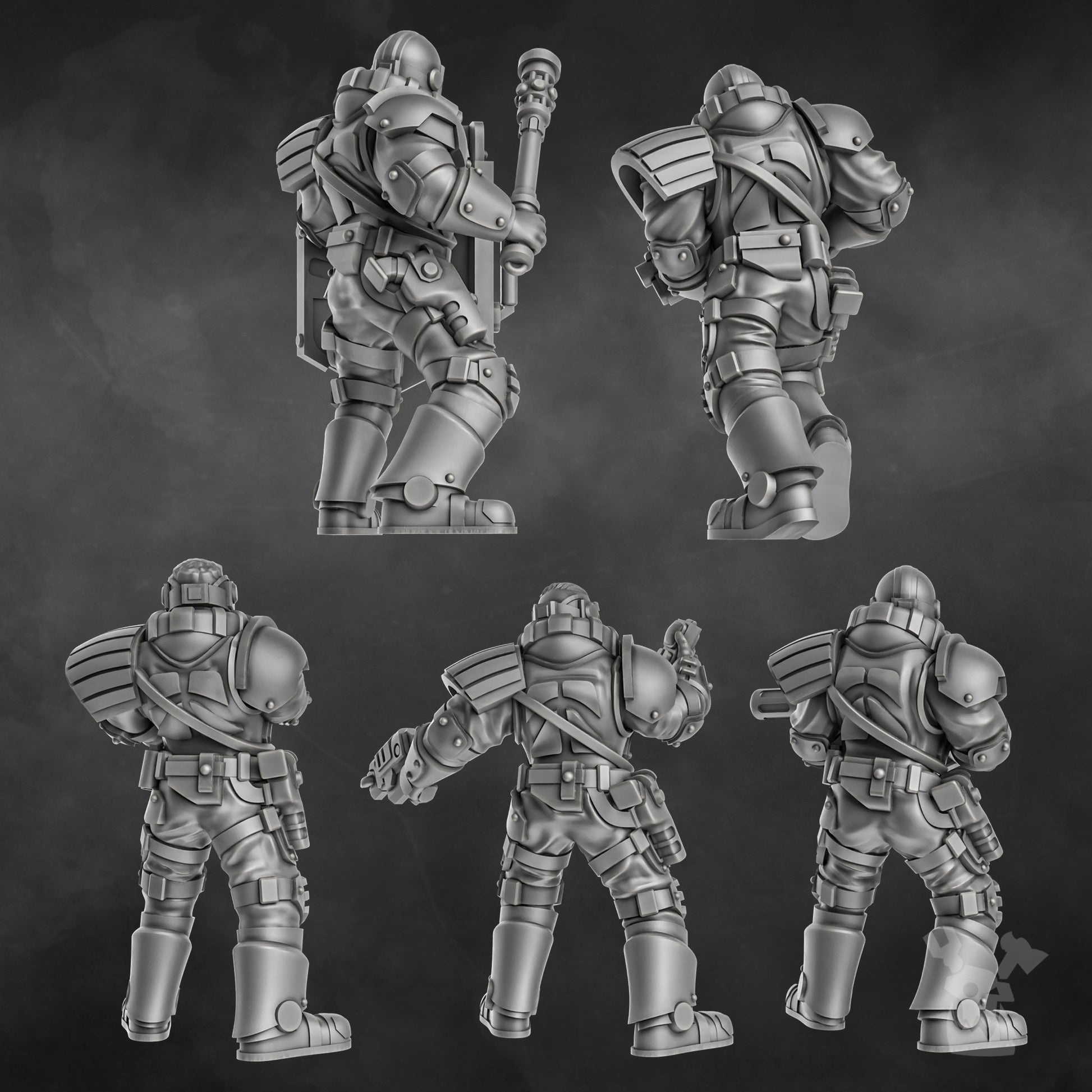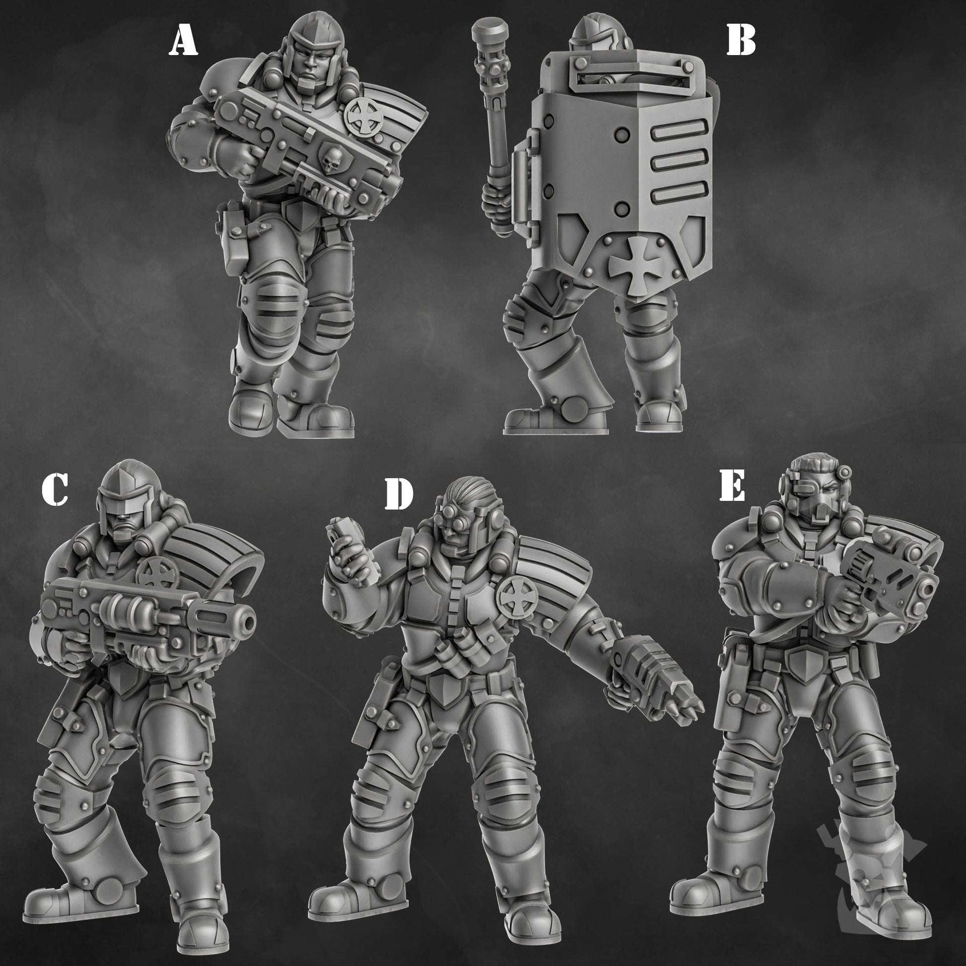 A squad of elite sci-fi troopers designed as proxies for the Extraction Squad. Each model features heavy armor, tactical gear, and unique weapon loadouts including rifles, breaching shields, and command equipment. Ideal for kill team skirmishes, narrative campaigns, or as specialists in any 28–32mm sci-fi army.