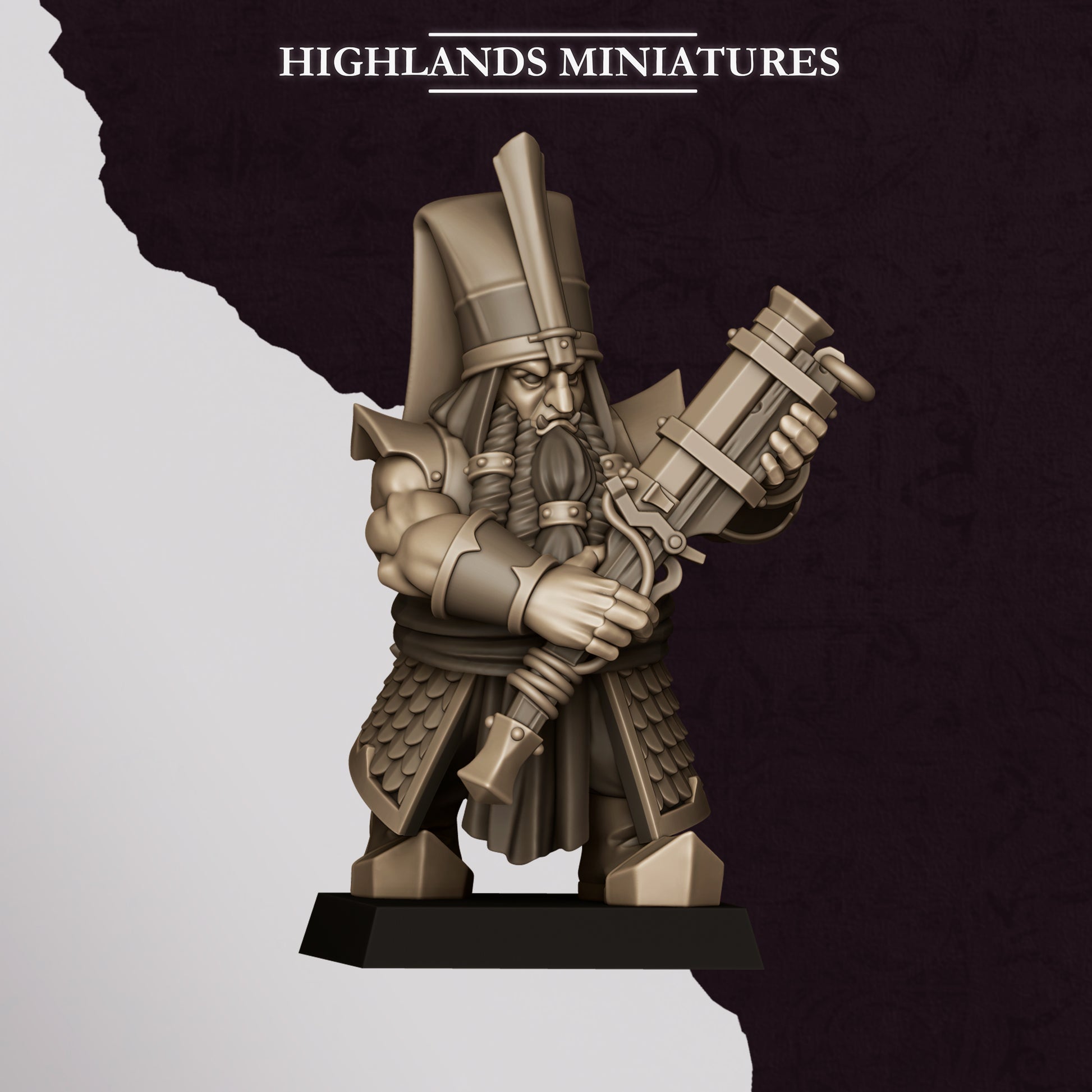 This 3D printed resin set includes the ranged infantry of the Sons of Marduk, armored dark dwarves equipped with deadly bluderbusses.  Each model features detailed scale armor, crested helmets, and grim expressions suited for fantasy tabletop warfare. Supplied as high-quality physical resin prints, these models are fully compatible with major tabletop fantasy wargames and rank up well for traditionally sized regiments.