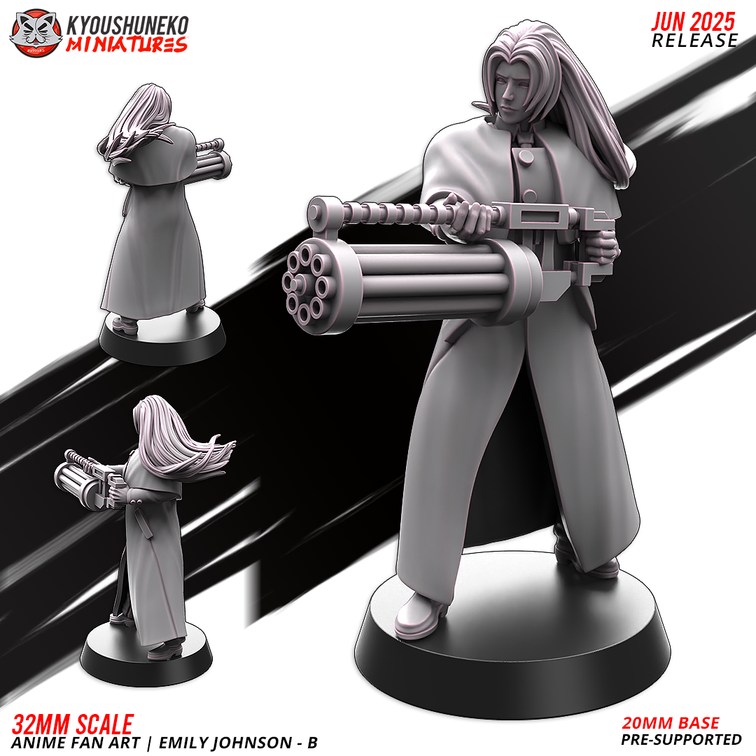 This 32mm resin miniature shows the same anime-inspired character wielding a large rotary cannon in a forward firing pose. The long coat and stable stance make it suitable as a heavy weapon fighter or hero unit in tabletop skirmish and RPG settings. Printed at true 32mm scale and supplied on a 20mm base for easy system compatibility.