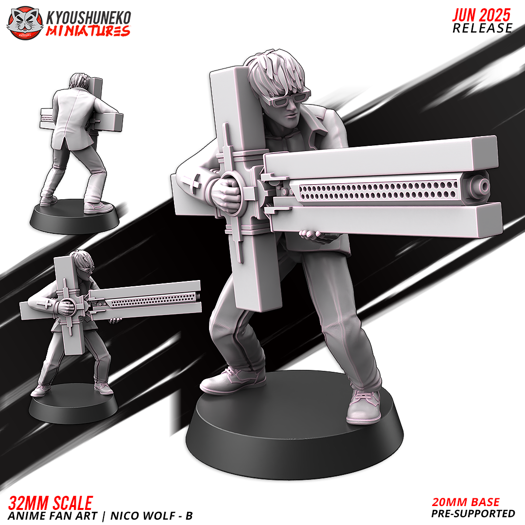 32mm scale miniature of a suited anime-style gun-fighter carrying an oversized cross-shaped heavy weapon. Designed for use in anime-themed skirmish games or as a character model in RPGs.
