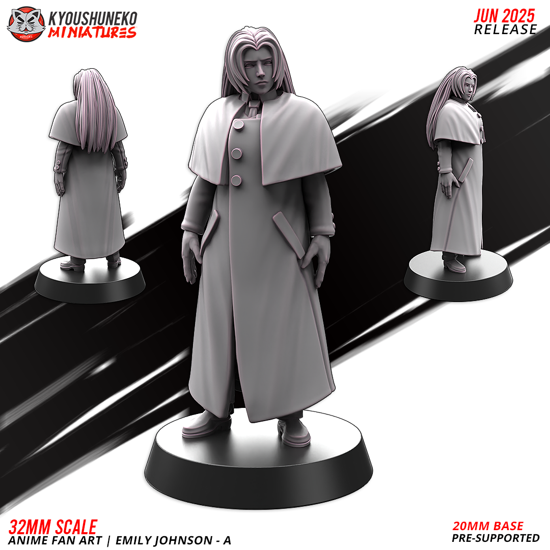 This 32mm resin miniature depicts a tall anime-style character in a long coat, posed in a calm standing stance. It works as a civilian, investigator, or story character for tabletop RPGs and skirmish games. Printed at true 32mm scale and supplied on a 20mm base for easy system compatibility.