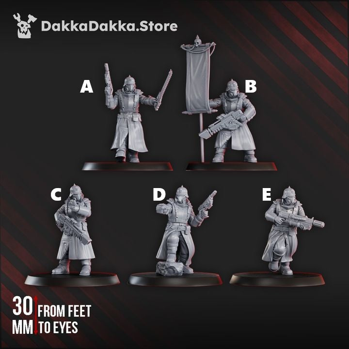 Scaled for 28–32mm tabletop wargames, these models are proportioned for heroic sci-fi aesthetics and fit standard infantry bases commonly used in grimdark systems. Ideal for popular grimdark sci-fi tabletop games, homebrew rulesets, and conversion projects, they integrate seamlessly with existing forces and terrain.