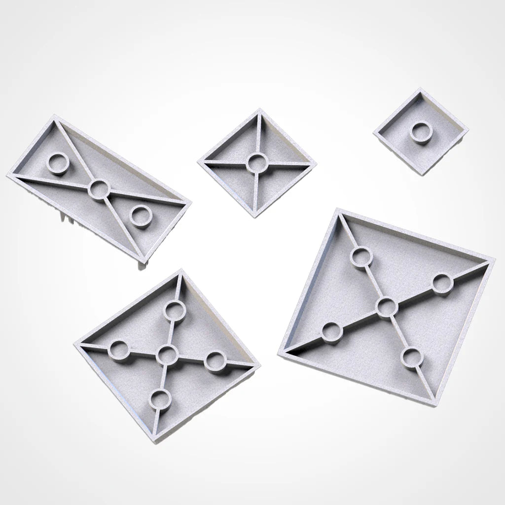 We provide full bases as well as 'toppers', which are thin enough to be glued on top of existing bases. All of our full bases have holes for 5x1mm magnets.