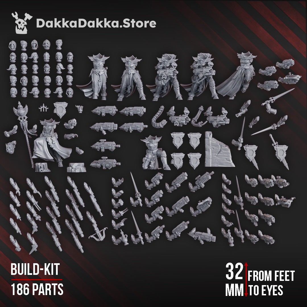 This build kit provides a full set of parts to create custom Maidens of Vengeance infantry for the Ordine Vendetta collection. We have torsos, heads, weapons, backpacks, and decorative options, you can assemble unique squads or enhance existing forces. Ideal for kitbashers and converters, this set gives you the flexibility to arm your models with melee or ranged gear, swap heads for character, and tailor units to fit your grimdark army theme.