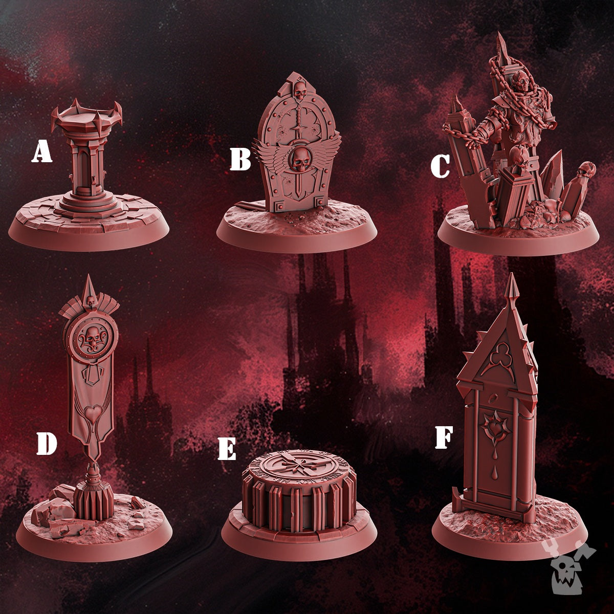 Objective marker set featuring gothic monuments, statues, and relics. Designed as thematic objectives for Blood Legion–style forces in grimdark sci-fi wargames. Scaled for 28mm–32mm tabletop play.