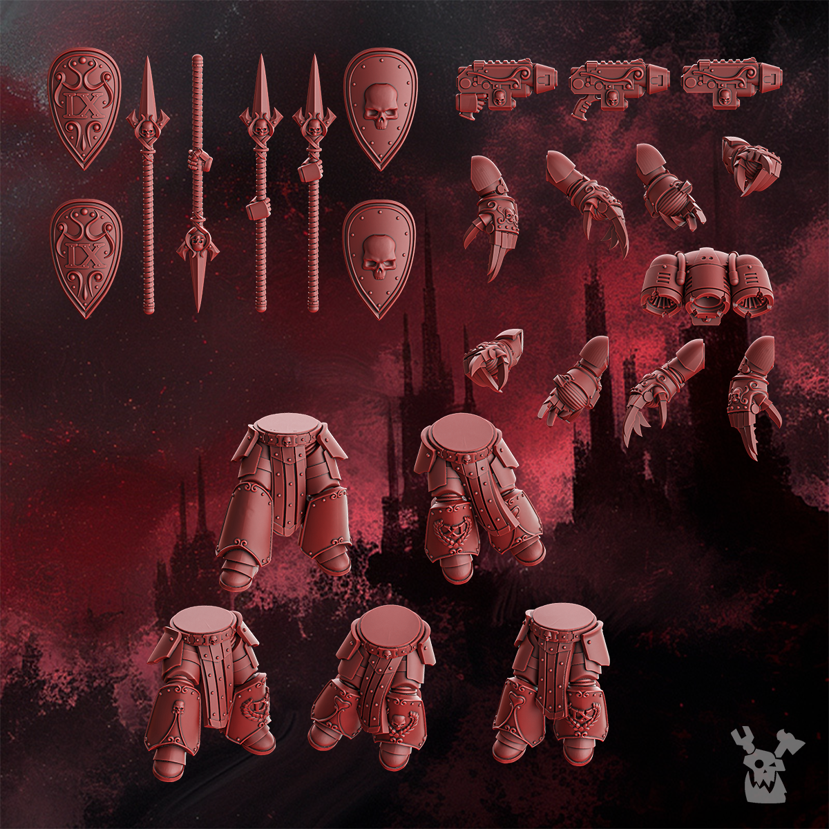Grimdark bits set featuring jetpacks, armored legs, shields, spears, and close combat weapons. Designed for dynamic assault troops, this upgrade is compatible with 28mm–32mm wargaming miniatures and ideal for Blood Angels–style conversions.