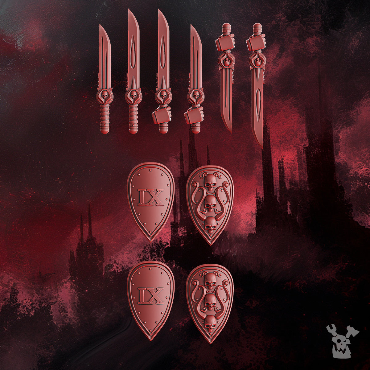 Bit set designed to build or upgrade tactical infantry squads. Includes torsos, legs, arms, heads, and weapons with ornate details to match the Crimson Wings theme. Sized for 28mm–32mm scale wargames.