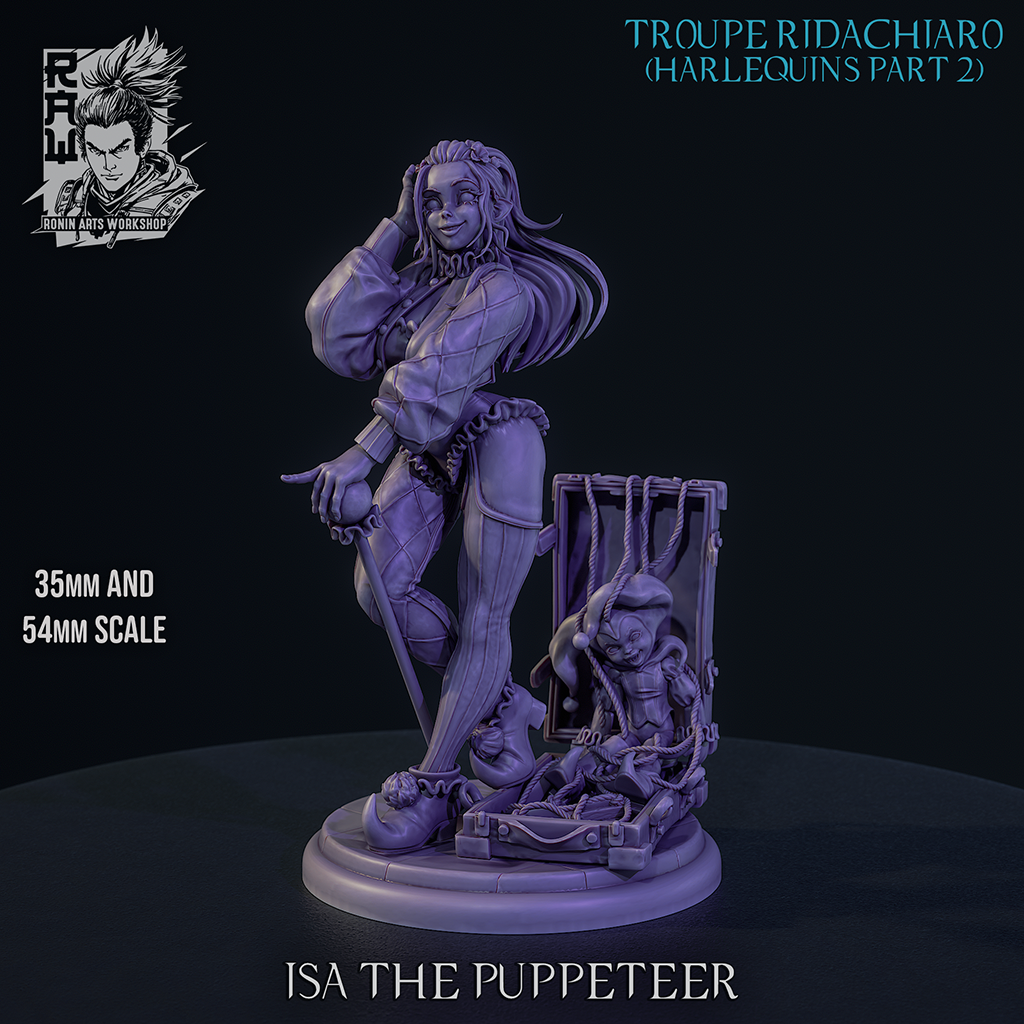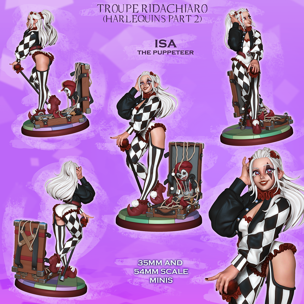 A female harlequin puppeteer miniature posed with one hand at her head and the other resting on a slender cane, standing beside an open case containing a small jester puppet tied with dangling cords. She wears a fitted jester outfit with diamond-patterned and striped panels, ruffled trim at the collar and hips, and curled shoes with pom-pom details. Her long hair falls over her shoulders, and the miniature is set on a small round base with the puppet case built into the scene.