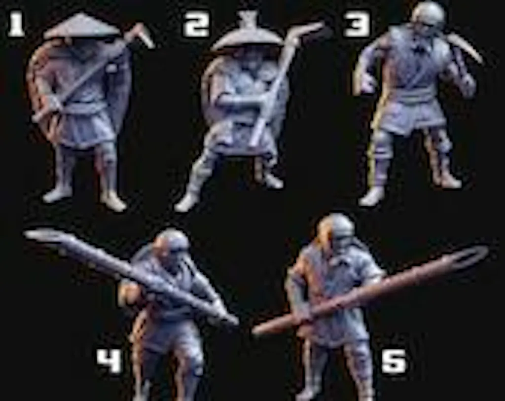 A set of feudal peasants miniatures forms a characterful infantry unit for samurai-inspired fantasy armies, suited for regiment blocks, skirmish forces, and tabletop wargames. These gaming miniatures add strong thematic flavor to fantasy wargaming, roleplaying games, and display-focused collections.