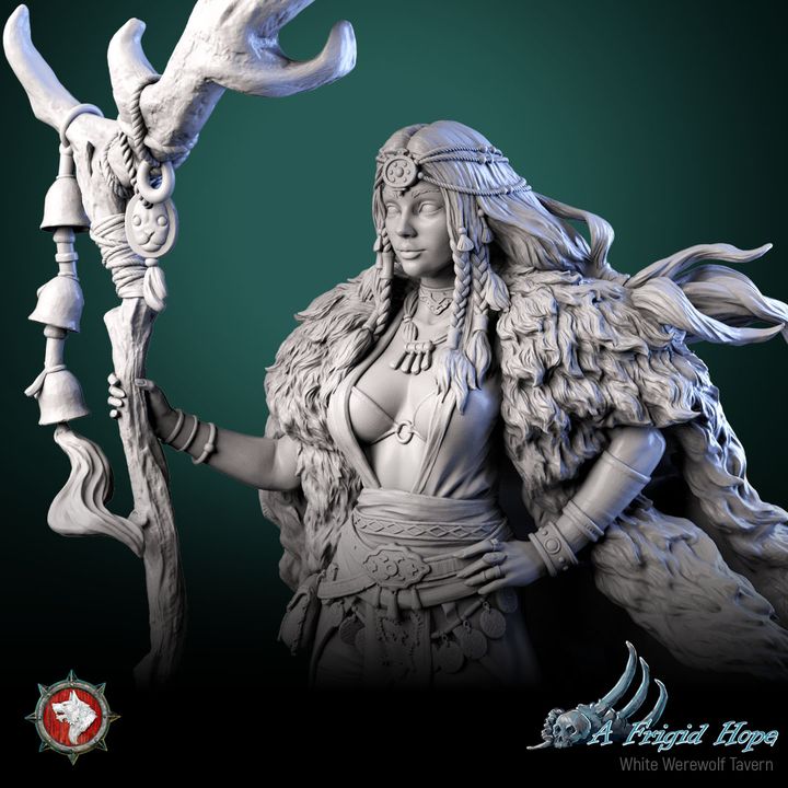This heroic miniature captures a barbarian sorceress wielding an antlered staff, clad in furs and armor that reflect her command of the frozen wilds. Perfect for tabletop RPG encounters or display, she embodies both mystical power and warrior strength in icy realms.