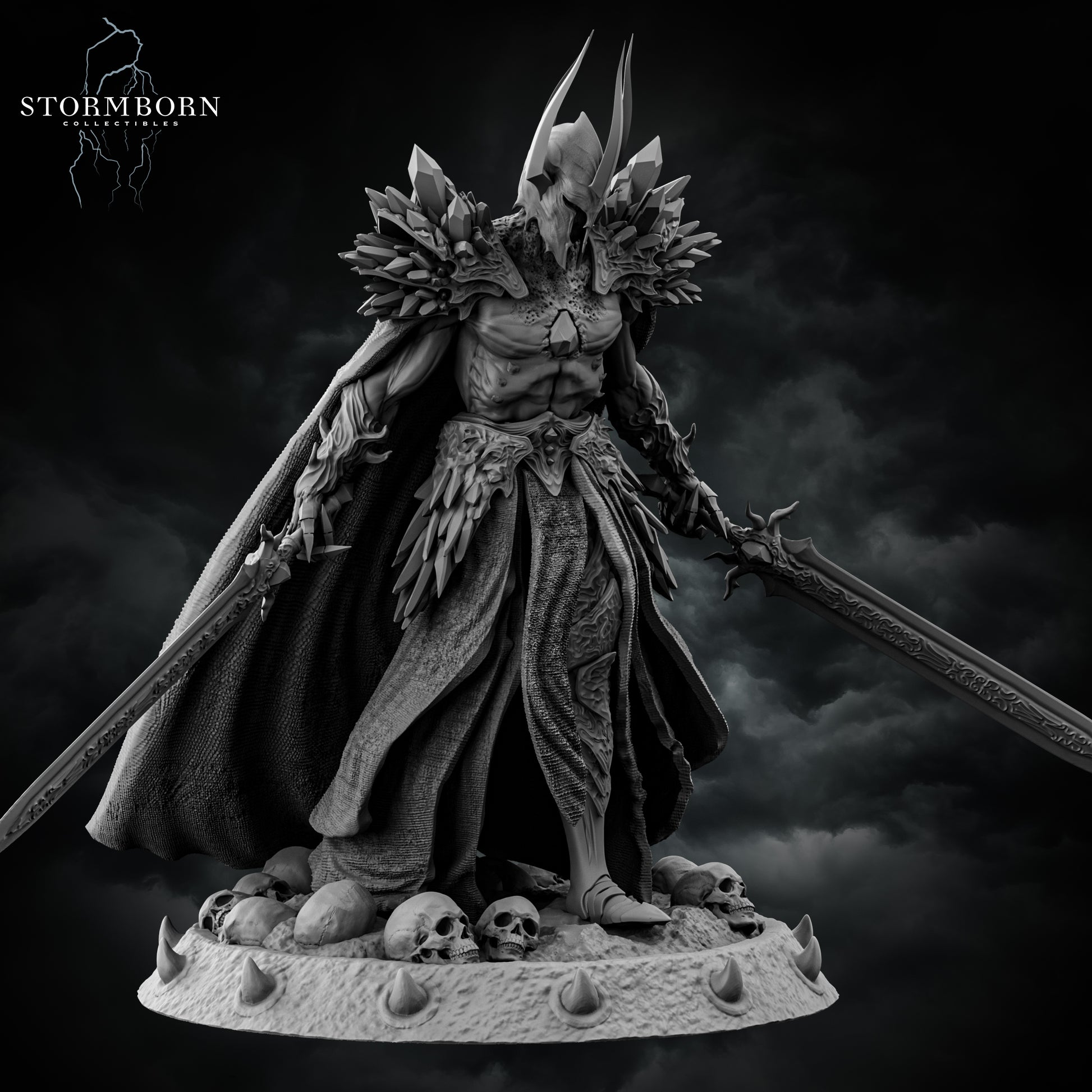 Malakar is a heavily armored warrior sculpted with a spiked crown helm, dual greatswords, and ornate plate covered in jagged bone and stone motifs. The model stands on a detailed base strewn with skulls and spikes, suitable as a dark champion, chaos lord, or death knight proxy in fantasy wargames. Available in multiple scales for display or tabletop use.