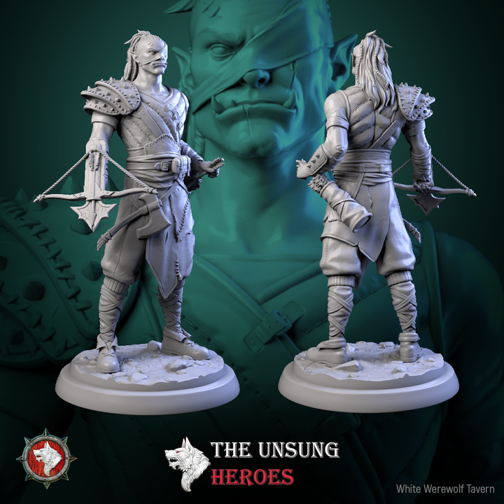 A rugged 3D resin miniature of a scarred mercenary armed with a crossbow and dagger. His worn armor and confident stance tell the story of countless battles fought on the road — a perfect model for painters who enjoy character and grit in their miniatures.