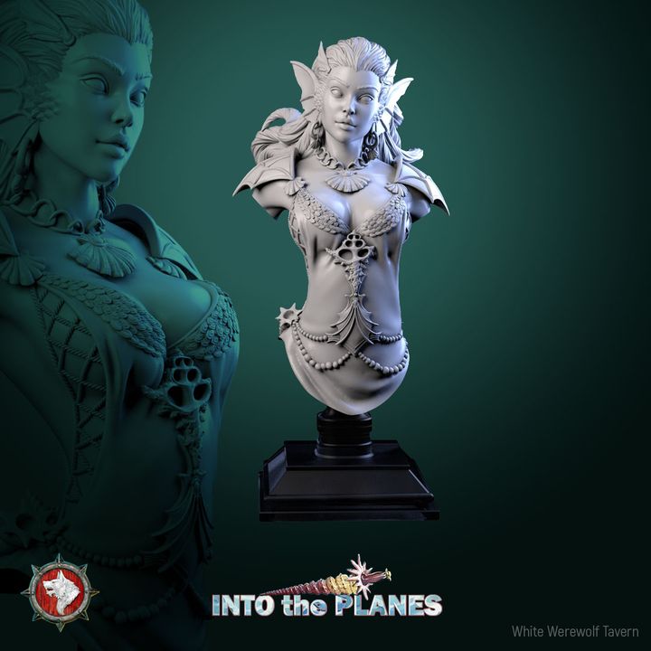 Fantasy resin bust for painters and collectors—a 3D printed display miniature with crisp, competition-ready detail. Sea-born merfolk aesthetic with finned ears, scaled armor, and flowing hair offers rich textures for glazing and NMM. Part of White Werewolf Tavern’s Into the Planes release; display-scale piece (not a tabletop game unit) that makes a standout showcase centerpiece.