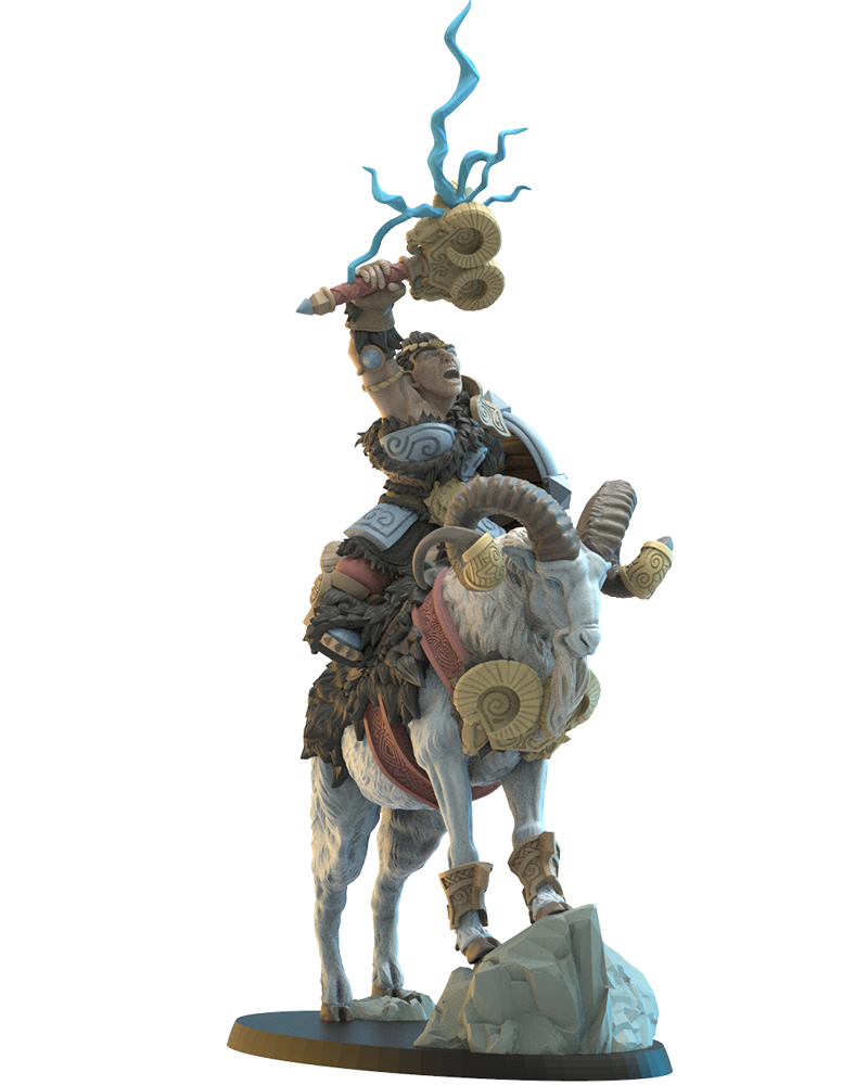 Female dwarven hero mounted on a war ram while wielding a thunder-charged hammer and shield.  Perfect as a proxy for a Dwarf Lord, Rune Lord, or Rune Priest.  Sized for fantasy tabletop wargaming, skirmish games, and RPGs.