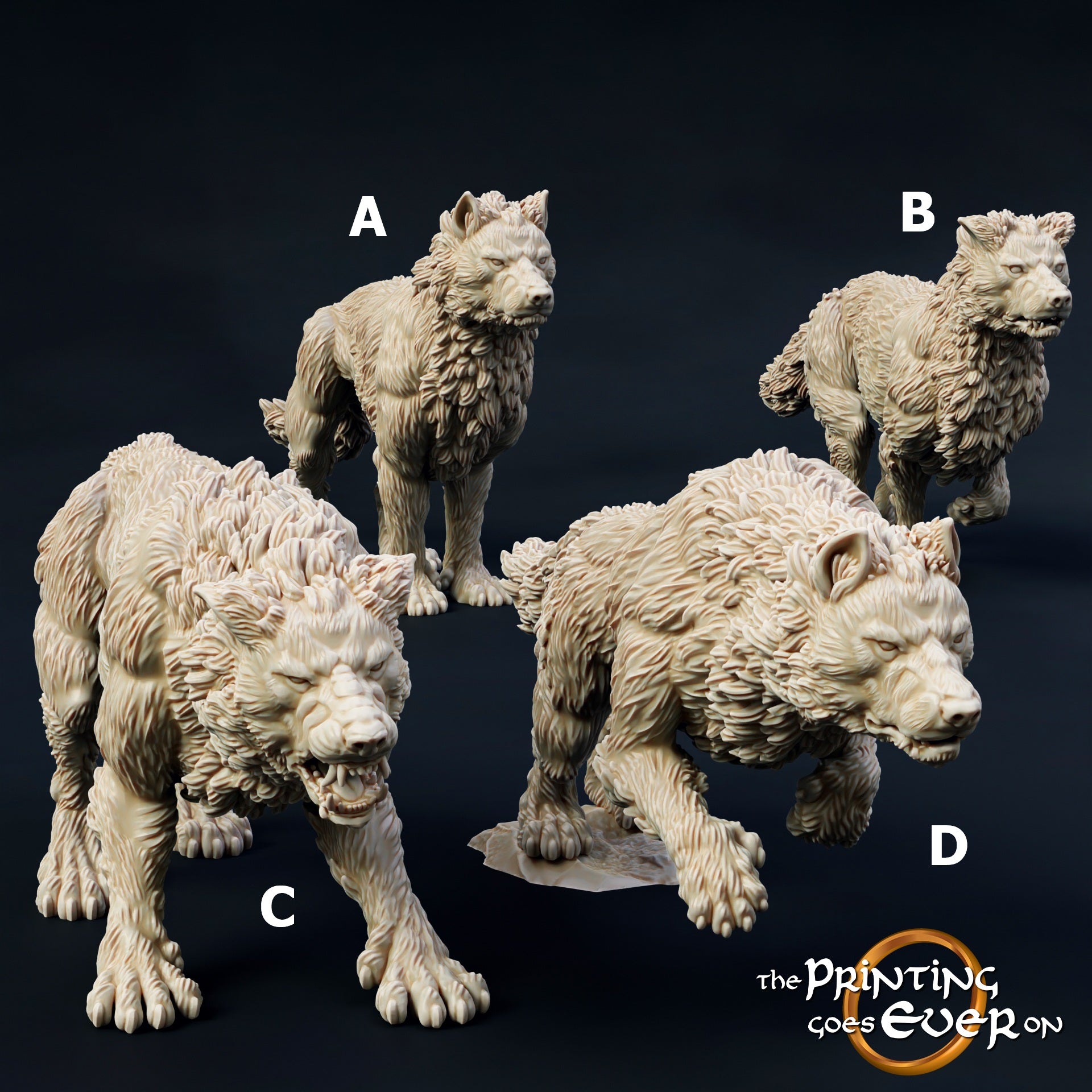High-detail fantasy creature miniatures depicting large, muscular wolves with thick fur, dynamic poses, and aggressive expressions. Designed as proxies for monstrous cavalry mounts, hunting beasts, or independent creature units in fantasy armies. Resin printed and scaled for 28–32mm tabletop wargames and RPG encounters.