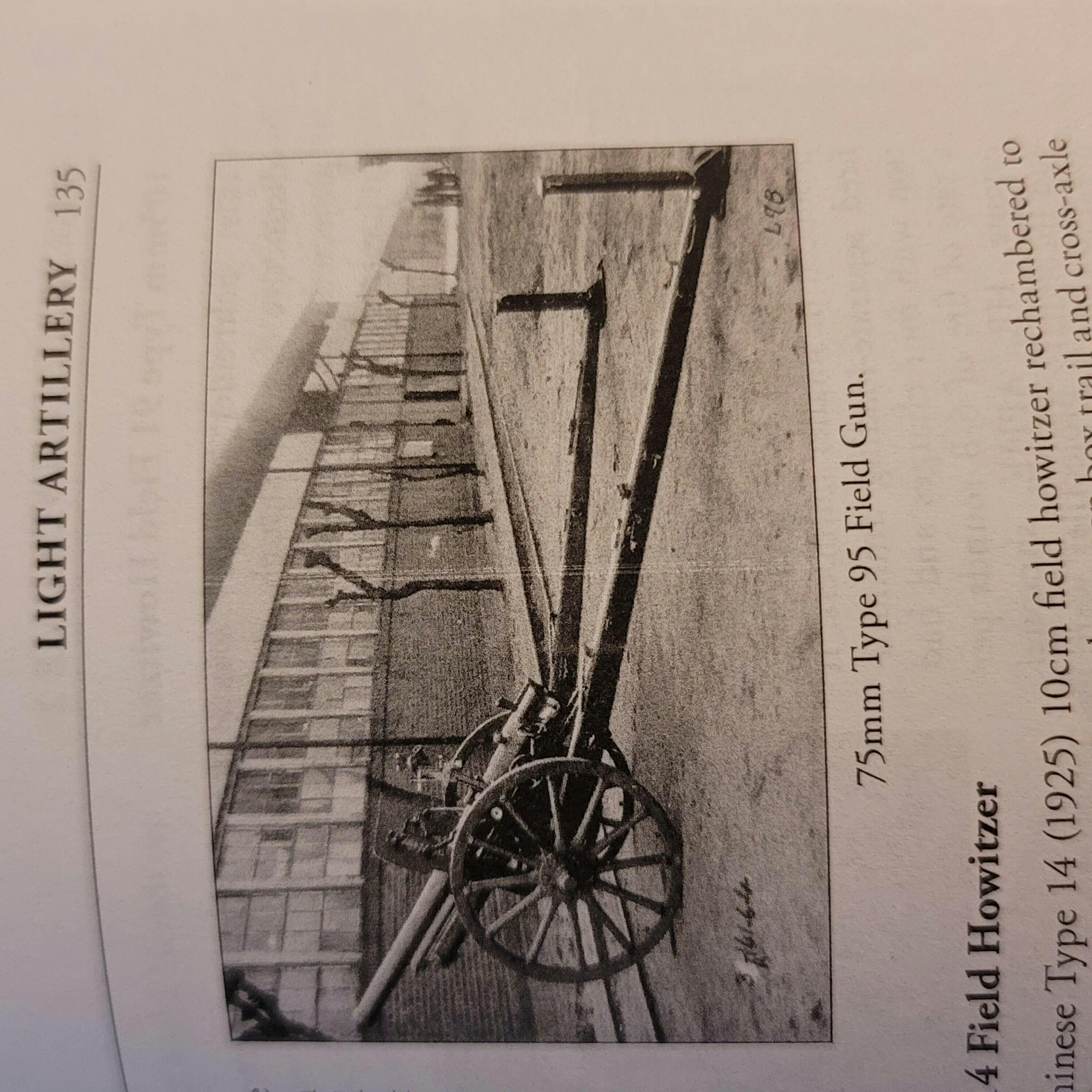 The gun looks much like a Japanese Type 94 75mm Mountain Gun except it is way too large. It more closely resembles a Type 95 75mm gun with shorter gun trails, perhaps to keep the model sturdy. Otherwise the gun is correct in appearance. Under 300 were made and used in China. Range was 9450 meters. The type 90 75mm out ranged it by 4000 meters.